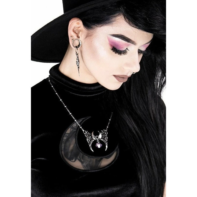 Inspired by autumn branches stripped bare, this design entwines two crescent moons w/ delicate branch motifs, crowned by a dangling raw-cut amethyst crystal arrowhead. A rare, sold-out piece that channels nature ✦ lunar cycles ✦ & witchy glamour — perfect for alt styling ✦ gifting ✦ collectors of dark fashion.