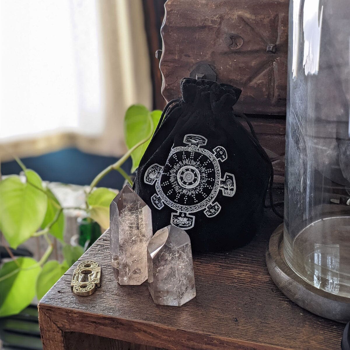 This elegant satchel provides a dedicated home for your complete set of Geomantic Visions coins, keeping all 20 pieces secure whether you're traveling to readings, storing them on your altar, or carrying them in your bag. The soft faux suede construction cradles each coin gently, while the drawstring closure ensures nothing gets lost. The satchel features a crisp white screenprinted Visions emblem that adds a touch of mystical elegance to the minimalist black design.