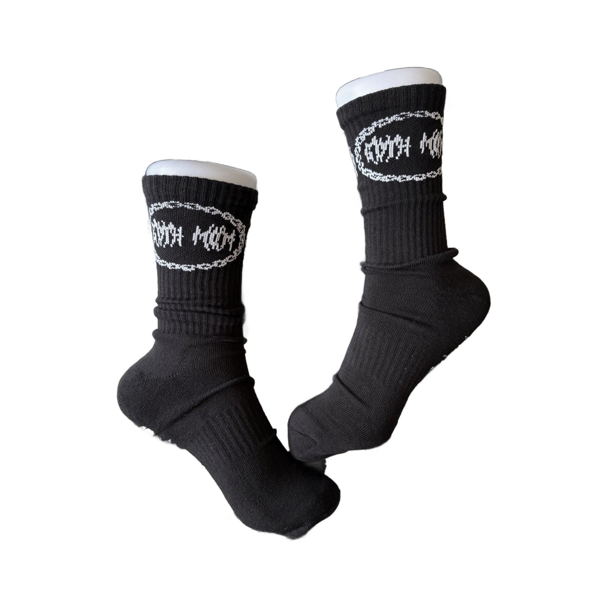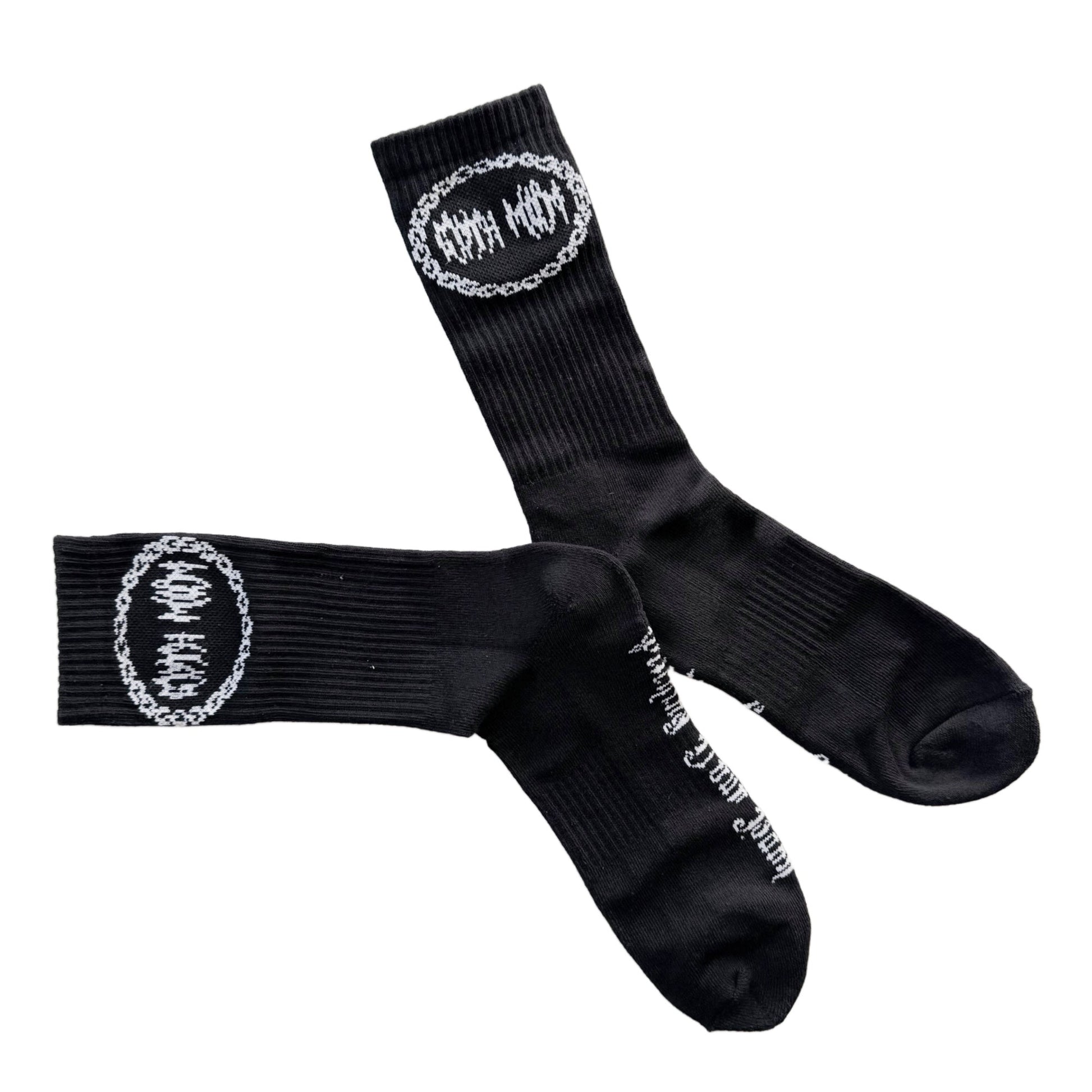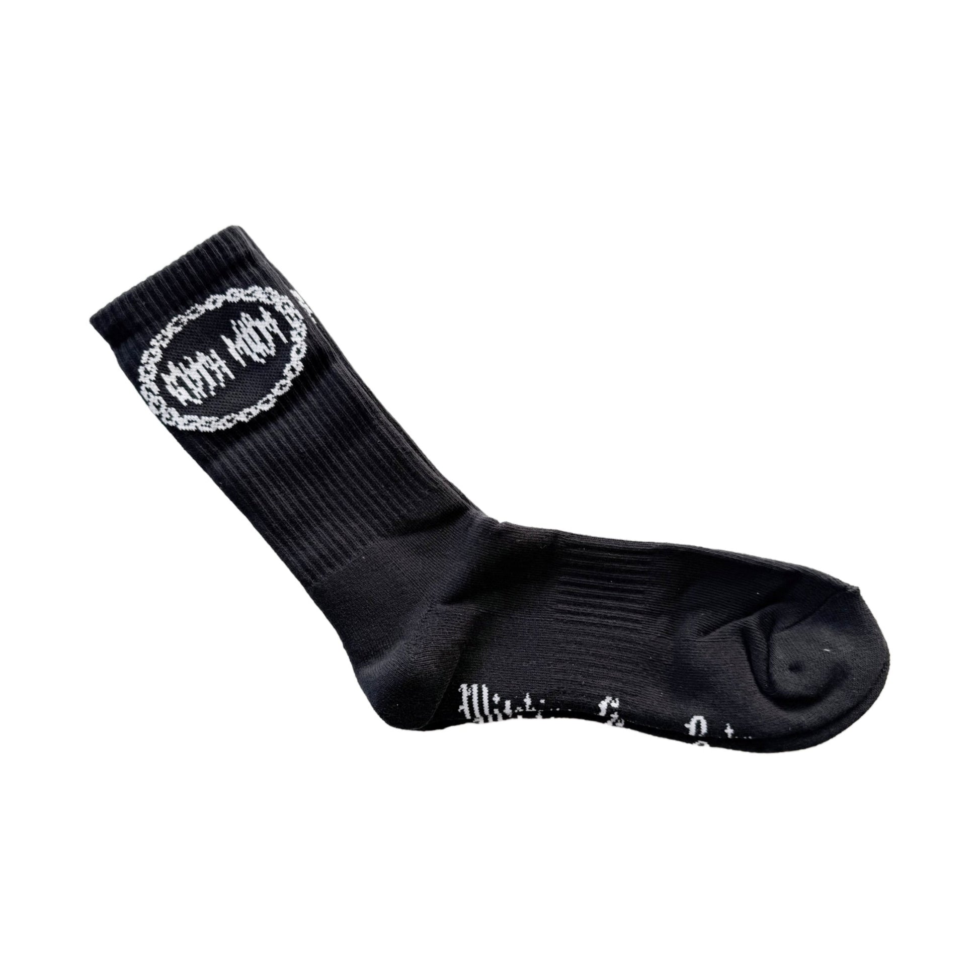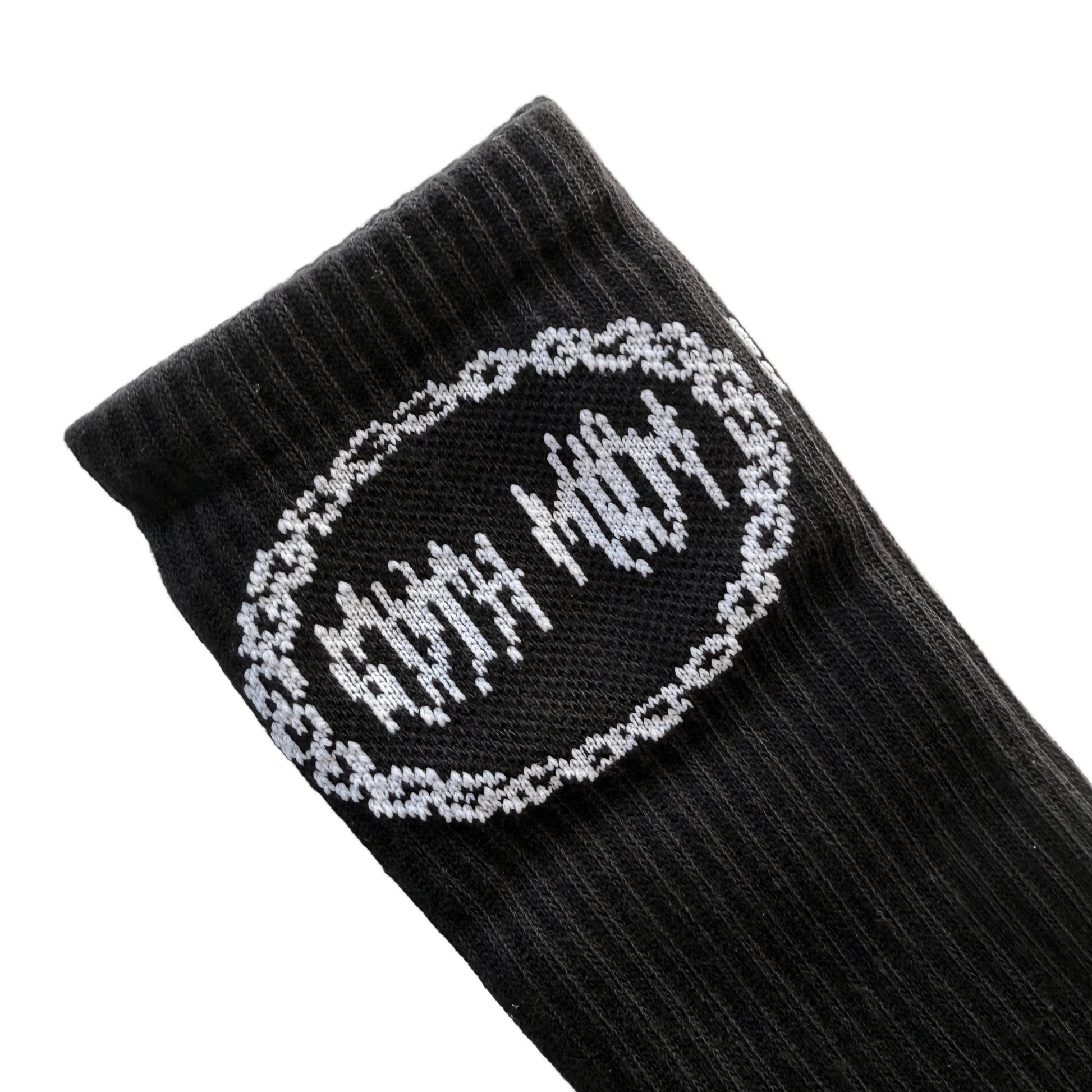 Our first Witching Hour Baby brand sock style just HAD to be one of our Goth Mom logos! These gothic crew socks feature a Goth Mom logo at the ankle (inner and outer) in white with the death metal font and an oval chain. The bottom features our Witching Hour Baby logo. Perfect for goth moms, alternative fashion lovers, and witchy style enthusiasts!