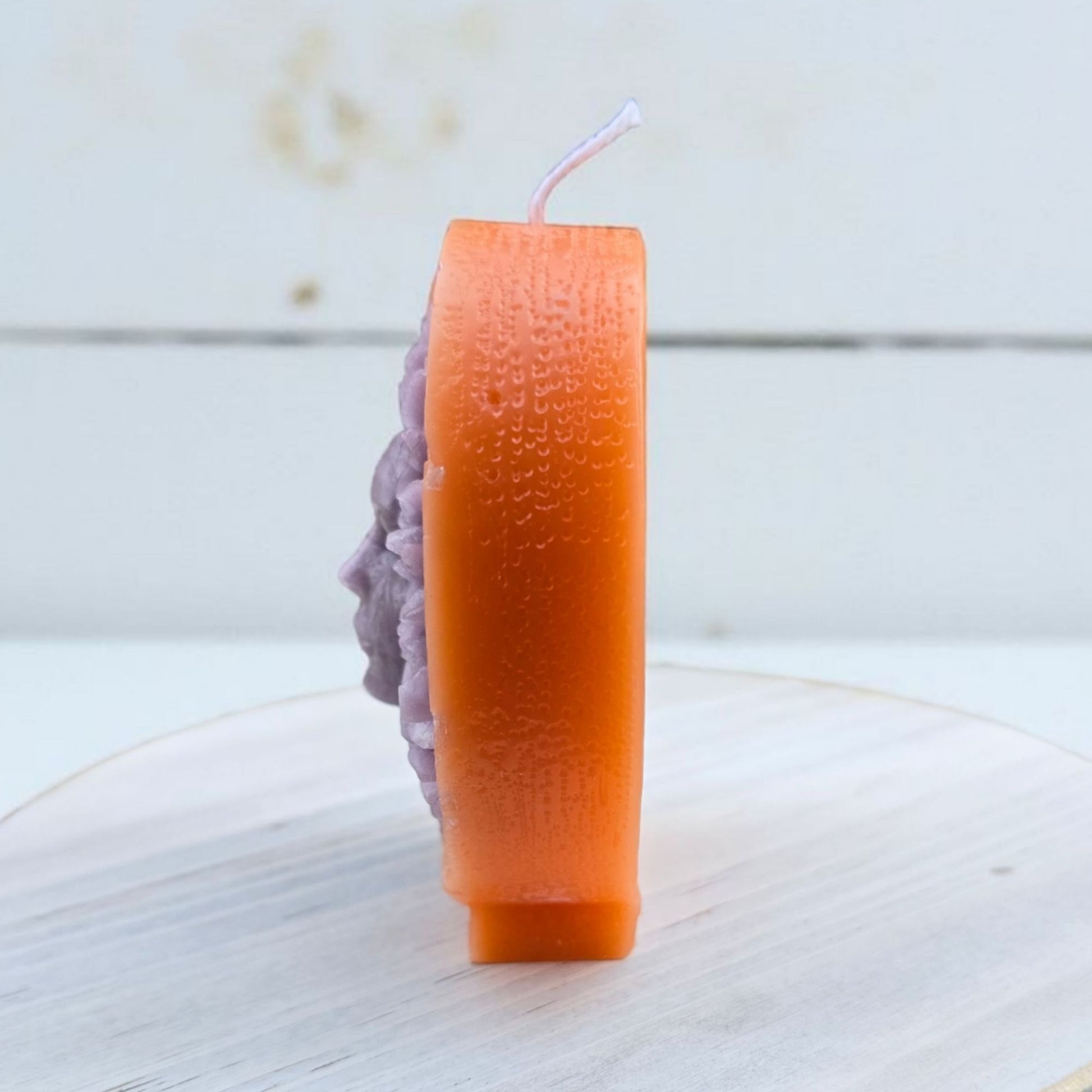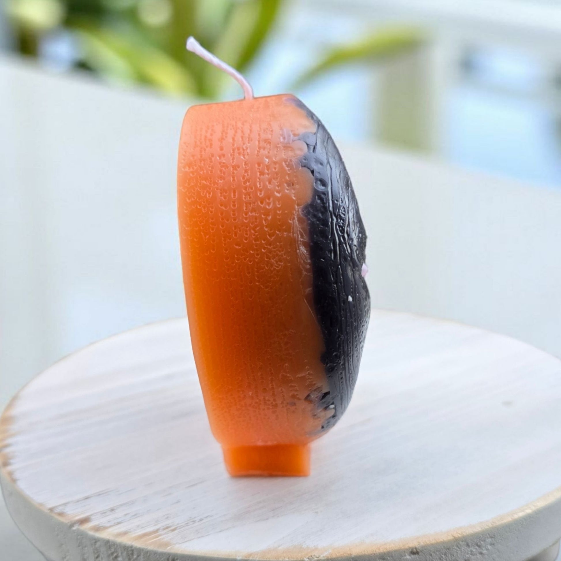 Hand-poured ✦ soy wax ✦ cotton wick, it layers decadent scents: the black moon infused ✦ chocolate chip cookies, the purple sun infused ✦ brandy, ✦ the orange background infused ✦ pumpkin pie.